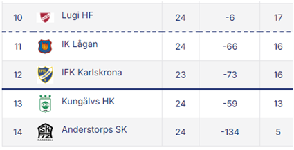 Vi ska dock fokusera på kampen om att klara sig kvar i Allsvenskan och kvalplatserna. Här står kampen framför allt mellan Lågan, Karlskrona och vårt Kungälv, men även Lugi kan bli indragna och Anderstorp är redan klara för nedflyttning.